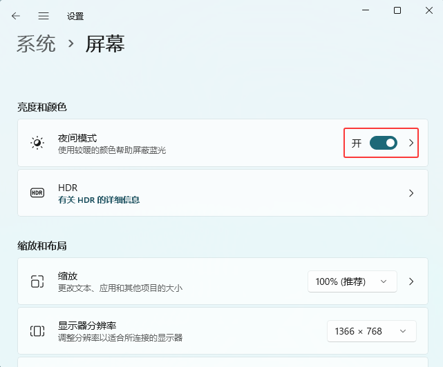 6、在【夜间模式】选项中,后面显示的是【开】,点击关闭即可。如下图: