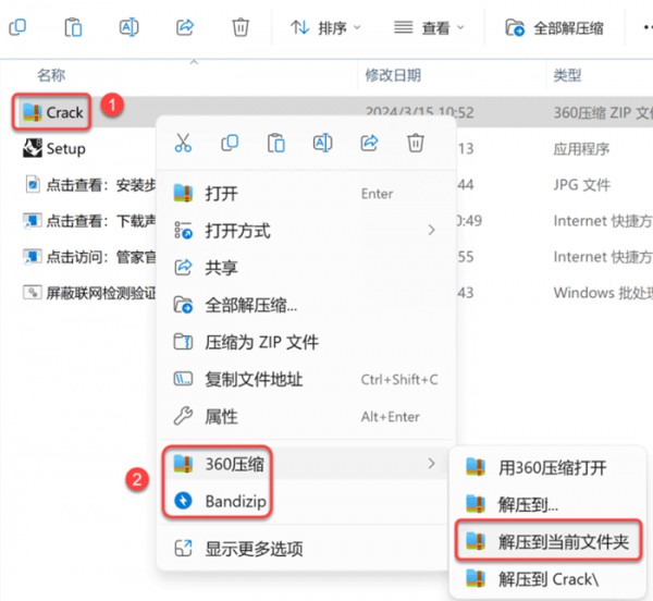 7、返回安装包,右击Crack压缩包,选择360压缩,选择解压到当前文件夹。