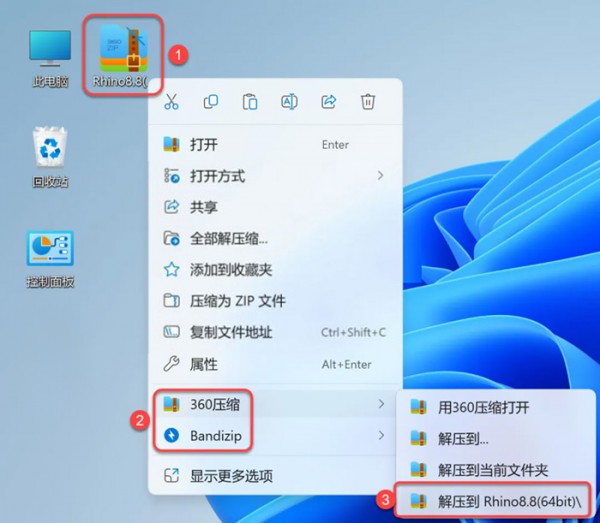 百度网盘下载:Rhinoceros(犀牛)8.9安装包 安装方法详细步骤: 1、右击下载好的Rhino8.9安装包压缩文件,选择360压缩或别的压缩软件,选择解到压Rhino8.9选项。