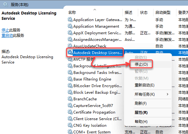 10、鼠标右击【Autodesk Desktop Licensing Service】选择【停止】。