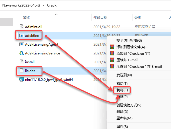 26、回到【Crack】文件夹,选中【adskflex】和【lic.dat】,鼠标右击选择【复制】。