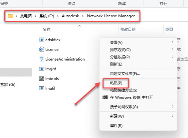 27、打开路径:C:AutodeskNetwork License Manager 在空白处鼠标右击选择【粘贴】。