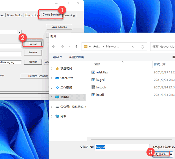 34、❶点击【config services】,❷点击【Brose】,❸点击【打开】。