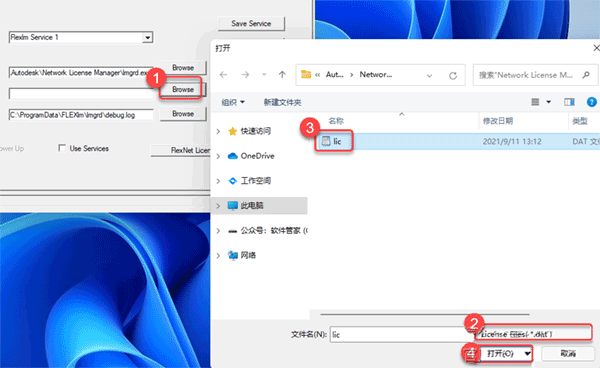 35、❶点击【Browse】,❷点击【展开符】选择"License Files(*.dat)",❸选中【lic.dat】,❹点击【打开】。
