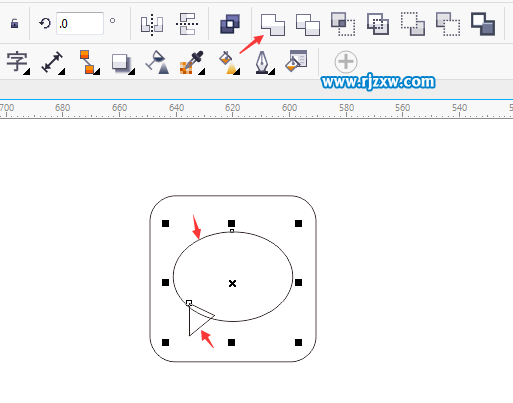 4、选中三角形,再按住Shift键不放,点击椭圆对象,这样就二个都选择了,点击合并焊接处理。