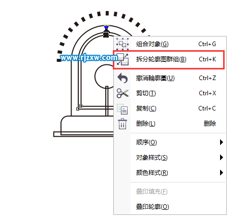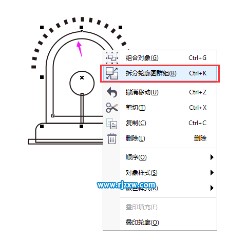 第9步:选中偏移后的图形,右击拆分轮廓图群组。