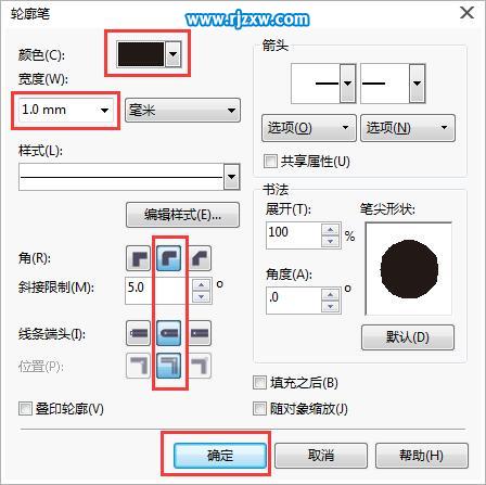 第6步:进入轮廓笔对话框,设置黑色,宽度为1.0mm,角为圆角,线条端头为圆点。