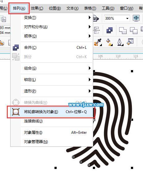 第7步:设置好后,选中所有对象,点击排列菜单,将轮廓转换为对象。