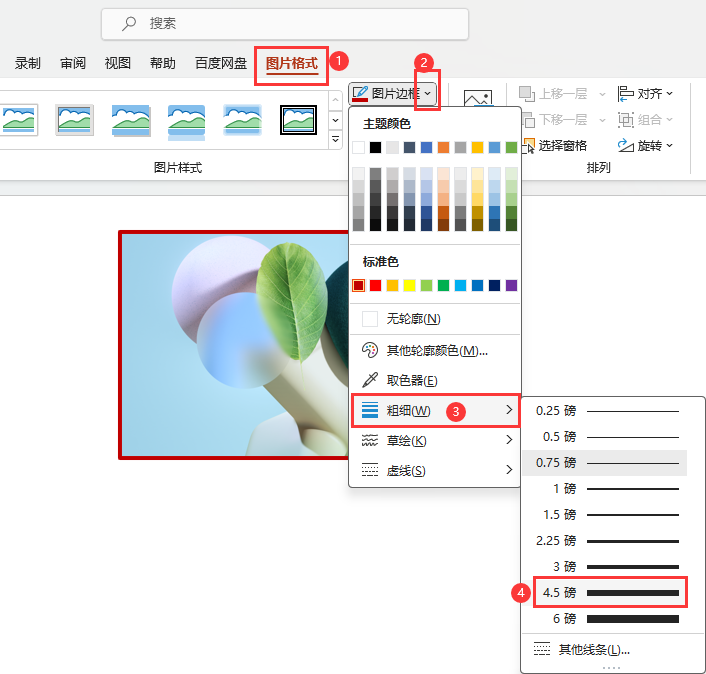 3、然后点击【图片边框】中,选择【粗细】中的4.5磅。