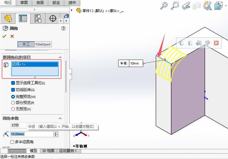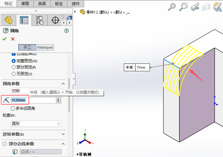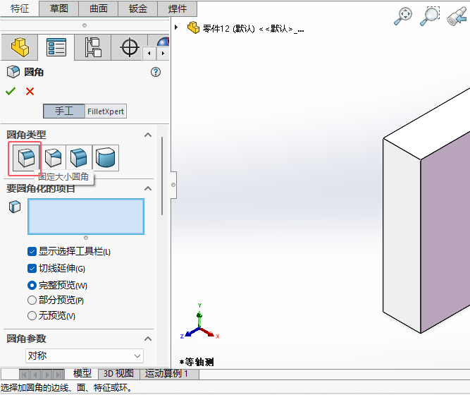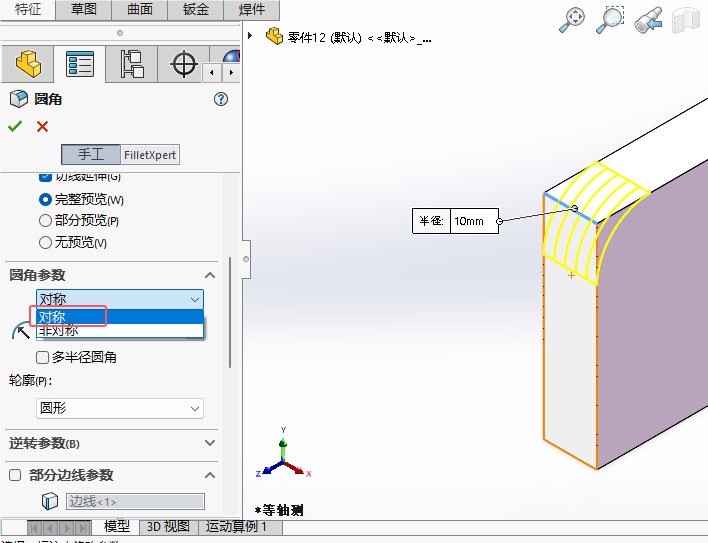 5、圆角参数,选择对称。