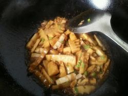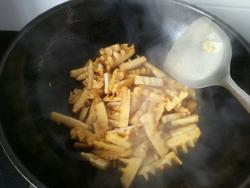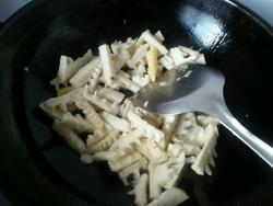2、热锅冷油把春笋倒入锅内,用小火煸炒断生。