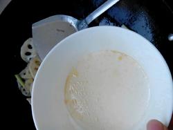 10.藕片炒几下,越来越透明,放入一勺生抽,一勺盐。