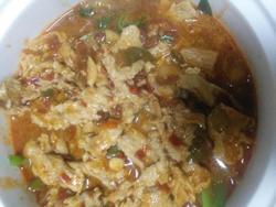 13.锅里烧油放上花椒 干辣椒 待油熟泼到肉上