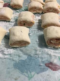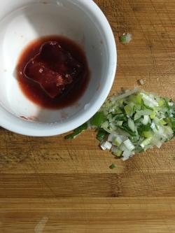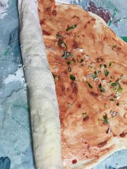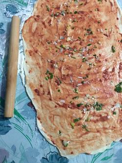 4.面团用擀面杖擀薄,涂上腐乳撒上葱花。