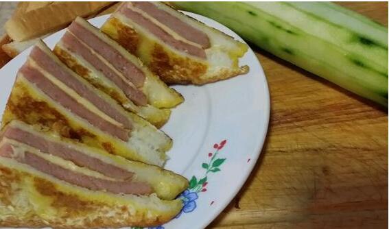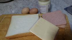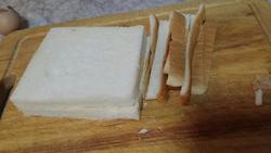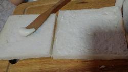 3.面包去边。 4.鸡蛋打碎在盘子里。 5.面包片单面涂抹沙拉酱或者花生酱
