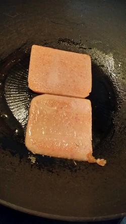 2.午餐肉放锅里煎一下