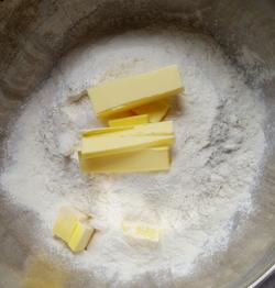1.首先将40g黄油切小块,温室软化,连同糖、盐加入面粉中,此美食由软件自学网首发,揉面团的时候要一点一点加水。