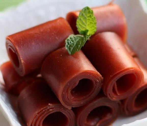 果丹皮用山楂制成的卷,红果又名山楂、酸楂、山里红,清水河盛产红果。
