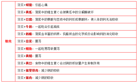 菠菜与哪些食物相克介绍表: