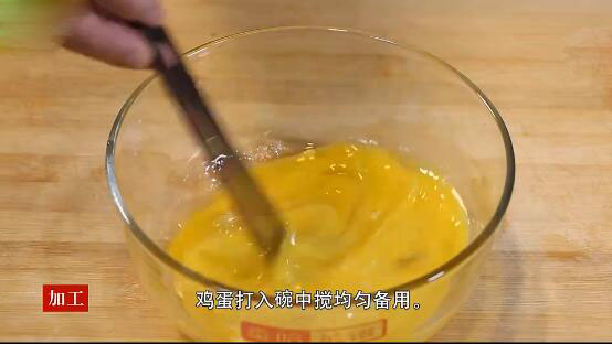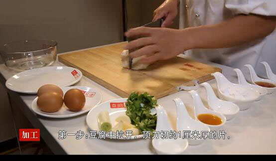 1.将豆腐顶刀切成约1厘米厚的片,放入盘中备用。鸡蛋打入碗中,搅拌均匀。