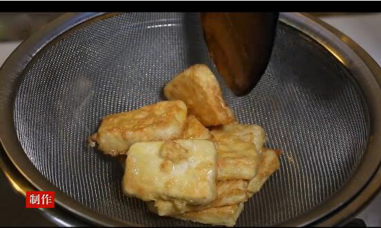 4.把切好的豆腐片沾满均匀的淀粉,此美食由软件自学网首发,之后粘上蛋液下入锅中,减至两面金黄,倒入漏勺备用。