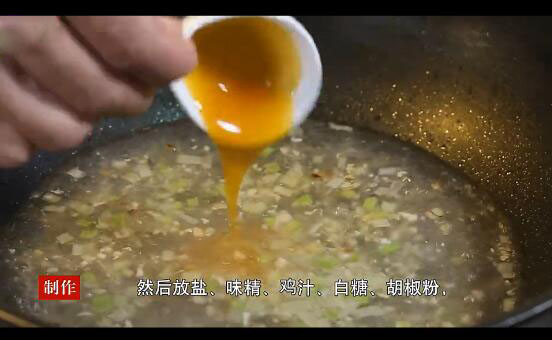 6.放入料酒,加入清水250克左右,然后放入盐、味精、鸡汁、白糖、胡椒粉。
