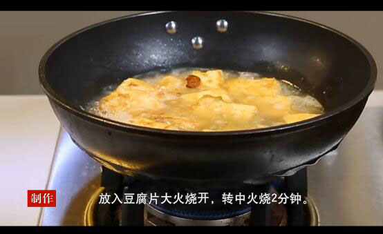 7.放入豆腐片大火烧制,转中火烧2分钟。之后大火收汁,淋入香油。