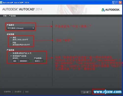 第6步、产品语言选:中文(简体),许可类型选:单机,产品信息序号列:666-69696969,产品密钥:001F1,点击下一步。