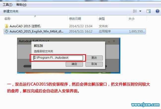 | 软件简介: 大家在安装CAD2015英文版时,看不懂英文没关系,下面就给大家介绍一下怎么安装AutoCAD2015英文版64位的方法与步骤,希望能帮助大家学习安装CAD2015 第1步、下载好CAD2015英文版32位安装包,双击进行解压,在这里解在D盘。