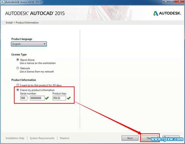 第4步、设置语言为English ,设置单机类型,序列号为:666-69696969,密钥为:001G1,点击NEXT下一步。
