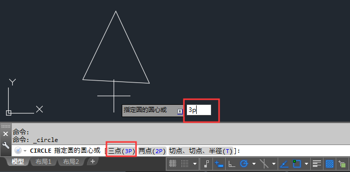 10、输入CIRCLE命令后,点击三点(3P)模式,也可以手动输入3P命令进入模式。