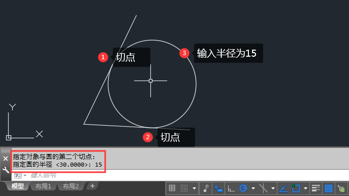13、然后选择二条直线的相切位置,输入指定圆的半径,效果如下: