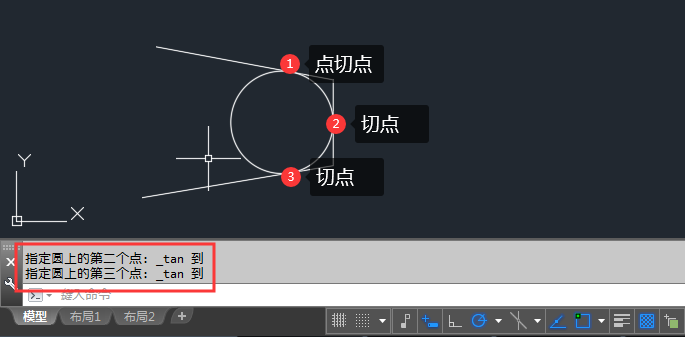 15、然后就可以点击三条线的切点来完成圆的创建。