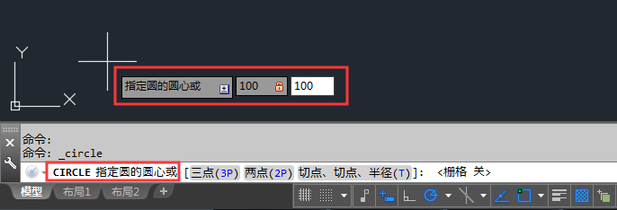 2、CIRCLE指定圆的圆心,你可以点任意点作为圆心。也可以输入X,Y的坐标。在这里参考100,100。
