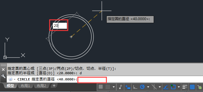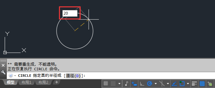 5、然后指定圆的直径参数输入。输入20为参考。那就完成了创建直径为20的圆。