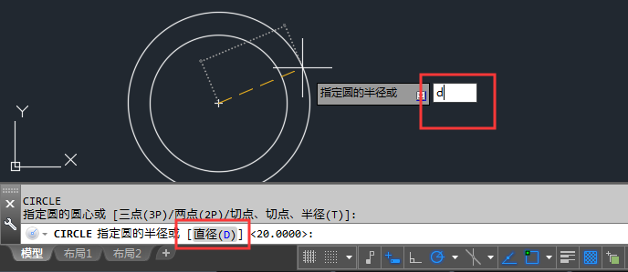 4、同样的命令输入后,定好圆心点。输入D或是点击直径(D)模式,进下一步。