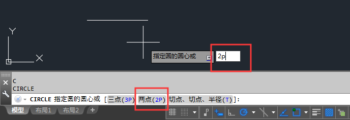 7、输入CIRCLE命令后,点击两点(2P)模式,也可以输入2P空格进入。