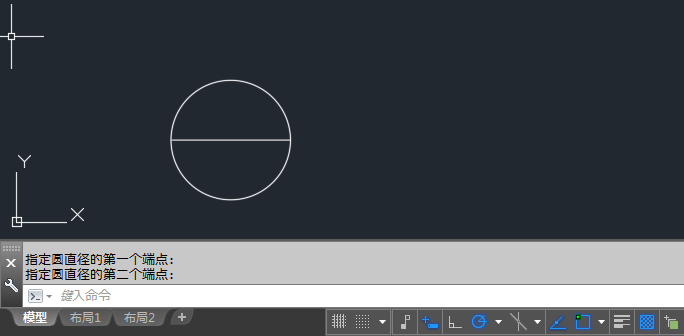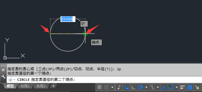 8、然后就可以选择指定圆直径的第一个端点与第二个圆点,创建两个端点画圆。