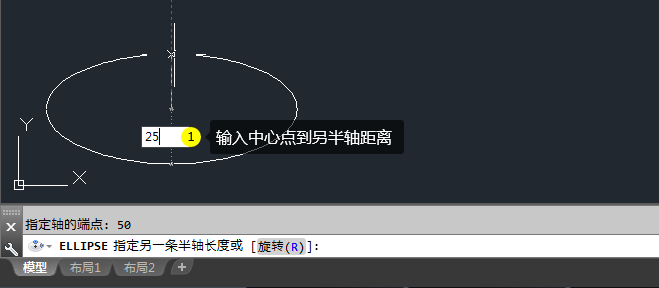 4、然后ELLIPSE指定另一条半轴长度,也就是椭圆宽一半的距离。设置好了参数,空格就完成了椭圆创建。