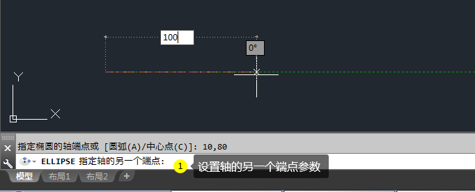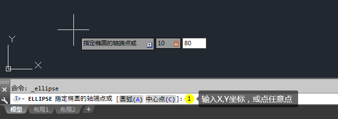 6、ELLTPSE指定椭圆的轴端点,也就是椭圆长度的起点。可以任意点或是输入X,Y的坐标点。在这里为10,80为参考。