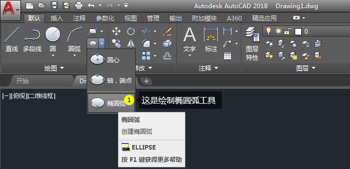 创建椭圆弧法:9、点击CAD绘画版块的椭圆工具系列,点击椭圆弧工具,也可输入ELLIPSE命令后,再入A命令。