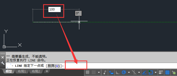 3、LINE指定下一点或,你可以点击任意一点后就会创建一条直线。也可以输入100,就是创建一条长度为100的直线。