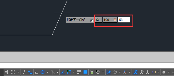4、LINE指定下一点,如果输入的是@100<53,那创建出来的就是一条斜线,长度为100mm并与水平线成53度角。