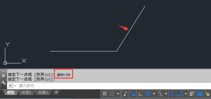 Line命令的用法:在命令栏上面输入Line空格--点击任意点作为直线的起点--下一点可以任意点击,也可以输入直线的长度空格。如果的斜线。请输入长度+角度。 注解:输入模式@80<58,意思代表的是直线长度为80mm,与水平线形成的角度为58度的斜线。