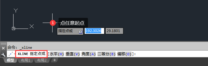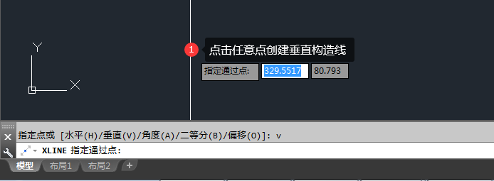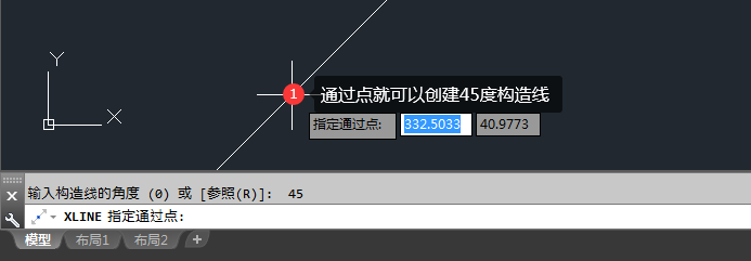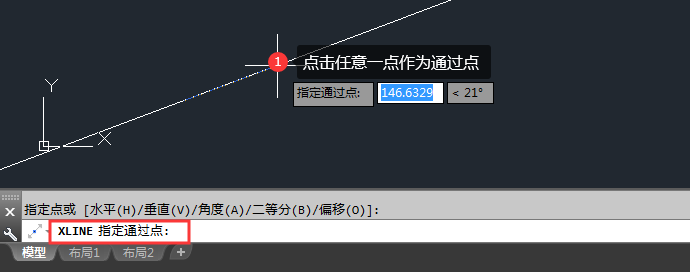 3、XLINE指定通过点,也可以随便点一点,就完成了构造线的生成。
