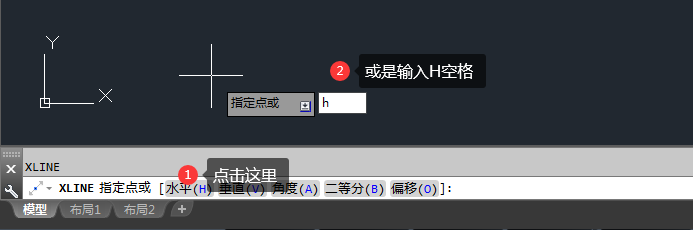 4、水平模式:输入XLINE命令后,点击水平(H)或是输入H空格。