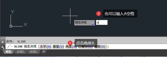 8、角度构造线模式,输入XLINE命令后,点击角度(A)或是输入A空格。
