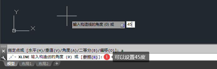 9、输入45度,也就是XLINE输入构造线的角度与水平线的角度成45度。你可以试一下不同的角度。