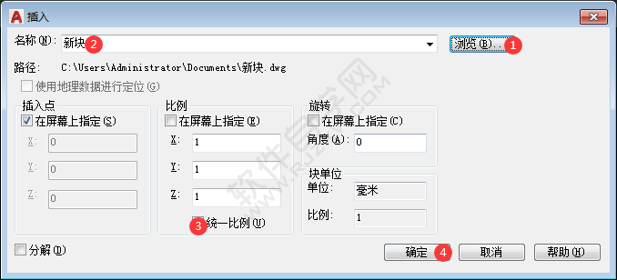 2、弹出插入面板,点击浏览,再选择要插入的块文件。设置比例,点击确定。