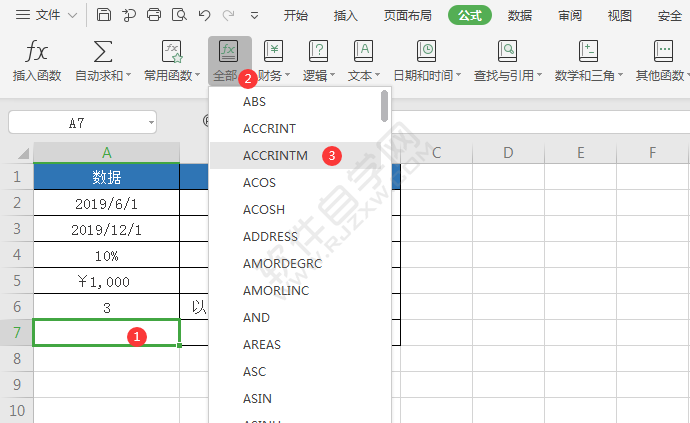 2、选择中要插入函数的单元格,点击公式菜单,点击全部函数,点击accrintm函数。
